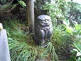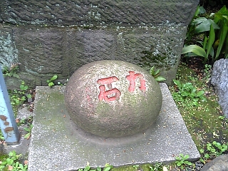 軽そうな力石。 盗難防止か(?)台座に接着してある。 下も合わせて力石だったりして。 しかも土の下がバカでかかったりして。 |