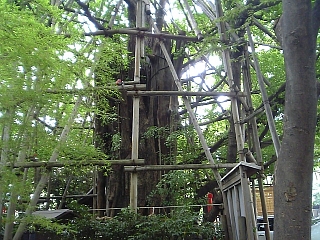 12:05 稲毛神社に寄り道。 結構東海道から離れすぎ? でも見所は多い。 まずは、樹齢1000年のイチョウ。 1000年!千年!せんねーん! 上部はないけど柱を組んで囲って大事に守ってます。 |