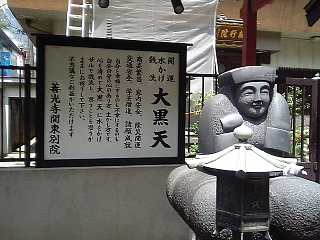 東海道に戻り、佐藤本陣跡などを通り、 善光寺関東別院の観行院へまたも寄り道。 門前に大黒天さまが。 説明板の不思議な御利益って気になるよねぇ。 |