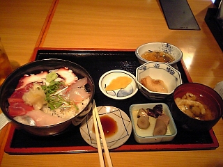 日替わり定食をいただく。 海鮮丼、味噌汁、小鉢3つ、ところてん。 これに お替り自由のフルーツみつ豆と珈琲が付いて850圓也。 13:15 ふたたび出発! |