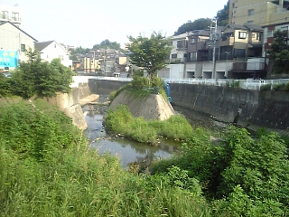 16:08 本陣跡や数軒の脇本陣、屋敷跡などの 中心地を過ぎ、今井川に出る。 川の真ん中に島が。しかも飛び石づたいに行けそうだ。 でも工事中のため河原に降りる道が封鎖中。残念。 |