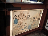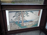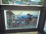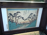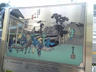 その絵の舞台、吉田大橋に到着。 橋の手前にある説明板にその絵が。 橋の欄干にも4箇所、浮世絵がある。 |