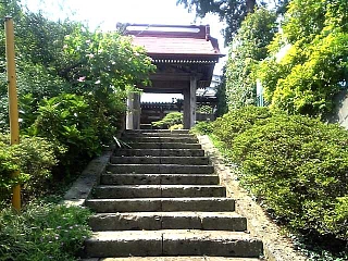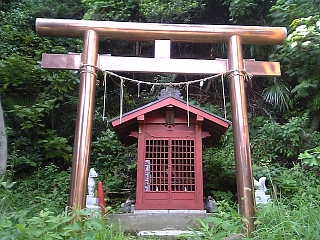 先に進むと土手の中腹に稲荷神社(?)が。 名前もわからないが銅色に光る鳥居がなんとも立派。 |
