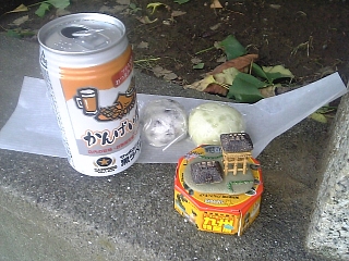 で、すぐに休憩。 だって、暑いしぃ。疲れたしぃ。 来る途中で買った中屋の和菓子とともに。 サッポロビールのオマケ企画「九州物産展」は吉野ヶ里遺跡。 うわぁー、東海道と全く関係なし。 |