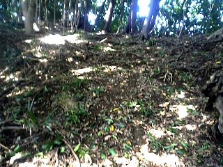 さらに裏山を登っていく。 結構アドベンチャー気分。 そういえば台風が去ったばかりなので緑の葉も大量に落ちてるし。 頂上付近にある富塚の碑を見て降りる。 |