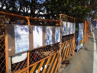 工事現場をのぞき見。 深緑のカバーがかかっているのが橋脚らしい。 工事完了後は複製が置かれるそうなので、 カバーがかかってても実物が見れて良かった? |