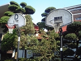 蓮光寺境内にて。 巨大サボテンやバスケのゴール。お寺には珍しい光景。 |