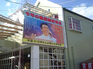 二宮駅入口交差点を過ぎると、 五木ひろし〜。 あ〜、年末商戦ですねー。 でも年間50万円お買い上げというのは・・・・。 |