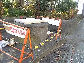 入ってすぐの吾妻神社鳥居前に井戸が。 立入禁止。(かなり固いガードだ。) 立ち入らない、立ち入らない。 こんなとこ。 |