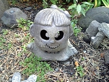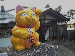 8:35 酒匂不動院。 招き猫がお出迎え。 表情からして思いっきり遊んでます。 |