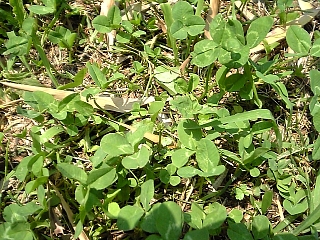 足元にはクローバーがいっぱい。 こうなると四葉のクローバーを探したくなる・・・。 探すこと数分。。。 |