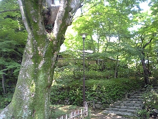 老欅荘への登り道。 木々の向こうにうっすらと見えるのが老欅荘。 手前の大木は名の由来の老ケヤキ。 |
