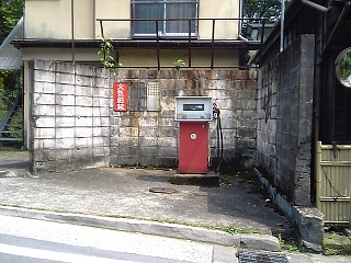 伊豆屋跡の向かいには灯油スタンドが! ブロック塀に薄く出光とあるが・・・。 |