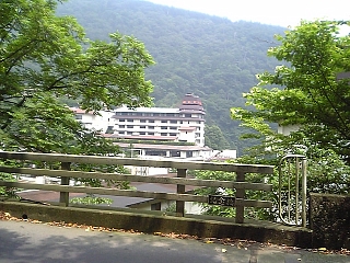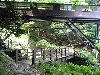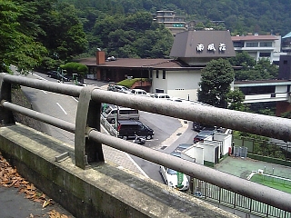 猿橋を渡る。 上にあるのはホテルの渡り廊下。 東海道の景観としてはマイナス。
