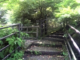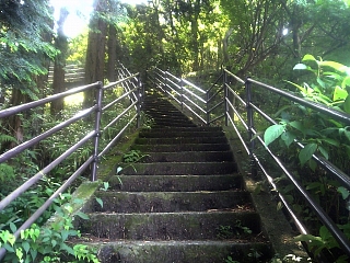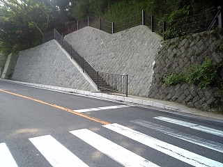 14:49 猿滑坂の標石を過ぎると県道に出る。 目の前の横断歩道を渡って階段を登る。 |