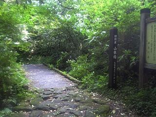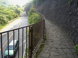 西海子坂の標石を過ぎると県道に出る。 七曲がりヘアピンカーブへ。 時々階段で近道できるが、基本的に車道を歩く。 |