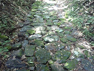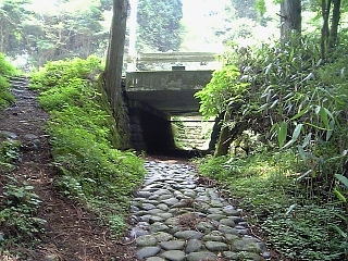トンネルを越えると石畳が角張った形になる。 上のトンネル前の丸い石畳と比べてみて! こっちが江戸時代の石畳だそうだ。 |