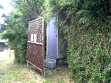 12:02 茨ヶ平の分岐に着く。 おぉ! 京都まで百里 とある。 ![]() その奥には公衆トイレも。 百里の道もトイレから? |