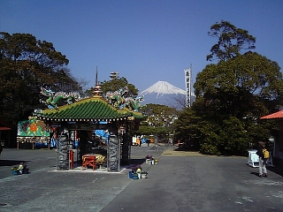 境内からは富士山が正面にバーンと。 中国風な香炉場と富士山って不思議な空間。 |