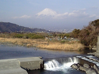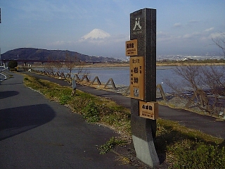 川を渡っても富士山。 手前は渡船場跡の夢舞台道標。 |