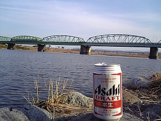 富士川町に入った記念! 電力が60Hzに変わった記念! ということは西日本突入?記念! 富士川橋を見つつカンパーイ。 |