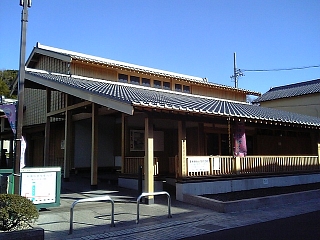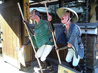 8:46 おもしろ宿場館の入口。 弥次さんと喜多さん!? 人形がおもしろい? この後も脇本陣が2軒、大正建築の清水銀行 など右に左に怒涛の観光が続く。 |