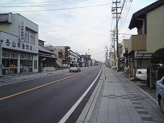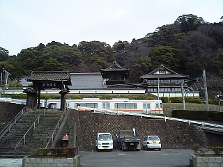 9:13 総門から出て東海道に戻る。 いやー、見どころあったなー。 っと、その時、 あっ、電車が! 総門と境内の間を電車が通るの図。 |