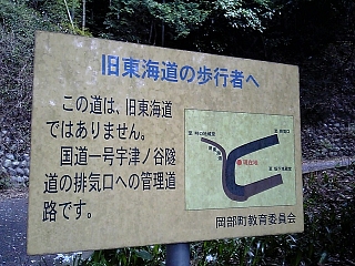 東海道を潰して作ったトンネル管理道に出る。 ![]() ご丁寧に説明看板が。 歩行者へって言葉は丁寧じゃないけど。 |