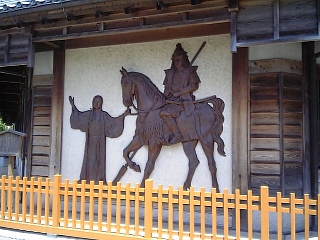 清水銀行掛川支店前のレリーフ。 一豊と千代、そしてへそくりで買った馬?
