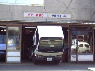 うわぁ、トラックが建物の中に! しかも、ボデー板張りって・・・何? |
