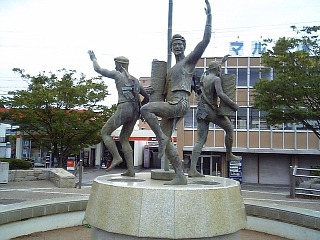12:44 電車でひと駅。新居町駅に到着。 駅前の銅像がなんか楽しそう。 イェーイ。 |