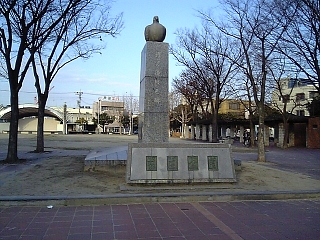 15:33 籠田惣門跡碑を過ぎて籠田公園へ。 巨大なハトが!? 戦災復興之碑の上に。