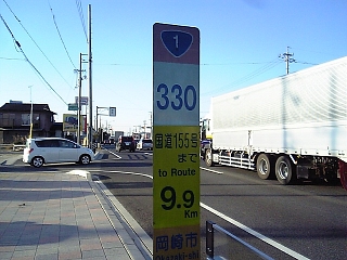 おなじみの国道1号の距離表示。 日本橋まで330kmなんですねー。 |