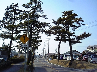 両側にわずかに残る松並木。 ここには樹木に注意の標識。