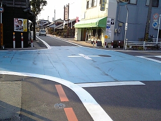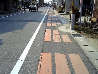 この歩道、何でこんな塗り方? 3人で並んで歩く用・・・なワケないか。 |