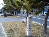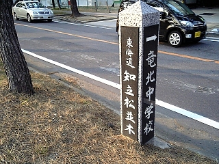 中学校の標示と兼用の松並木石柱。