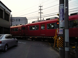 名鉄三河線の踏切を渡る。 おっと、ジャスト通過! |