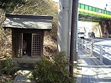 交差点左には祠。 その先は名鉄の高架が。 |