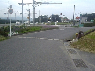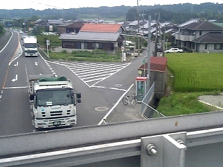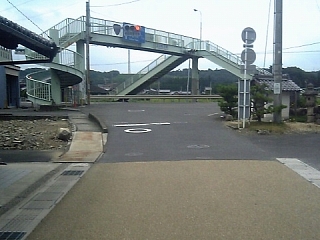歩道橋で国道を渡る。トラック恐いもーん。 東海道は右の道へ。 要するににクロスしている。 |