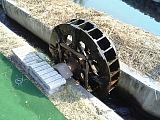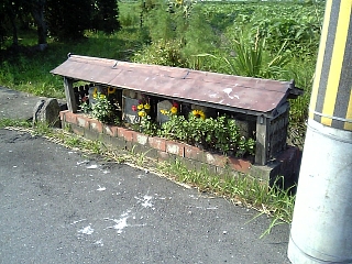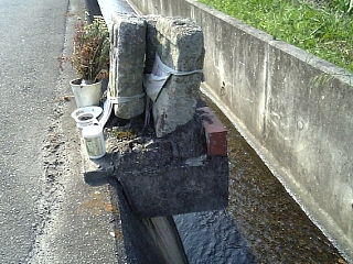 水路の上に石仏がある風景。 横から見ると落ちそうなんですけど。 コンクリートの土台、がんばれ〜! |
