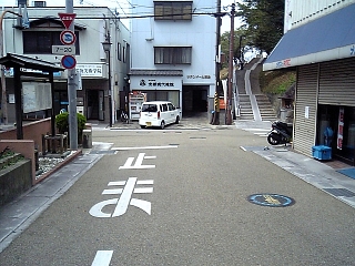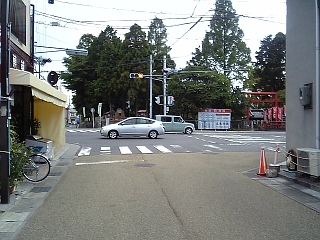 立木神社前交差点で県道141号線に出る。 カラー舗装が終わる。 ここで草津宿の中心部も終了。 |