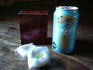 52日目 地蔵いっぷく亭 キリン スムース 350ml 低発酵で低アルコールで低炭酸。 クリーミーな口あたりとふわっと軽やかなうまさが特長。 原材料:発泡酒、大麦スピリッツ。 アルコール分4% 2008年9月17日発売。 リキュール(発泡性@)。 関宿名物の関の戸と志ら玉とともに。 尾崎酒店[\150] | ||||||||||