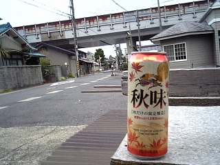 58日目 国道・名神高速道路接続道付近 キリン 秋味 500ml 発売19年目の秋の定番ビール。 麦芽たっぷり1.3本分使用。 秋の味覚にふさわしい旬の食材を楽しみながら、 じっくりと味わえる秋ならではのビール。 原材料:麦芽、ホップ、米、コーン、スターチ。 アルコール分6% 2009年8月26日発売。 ファミリーマート栗東手原店[\284] | ||||||||||