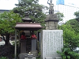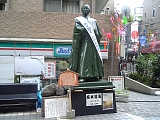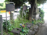 {右・寄}坂本龍馬像 海雲寺がある青物横丁駅付近から鮫洲、立会川と2駅分くらい歩き右折して立合川駅に行くと駅前に坂本龍馬像がある。台座を除いて高さは約2.2mの強化プラスチック製。高知市の生家跡にあるホテル南水に飾られていたものを2004年に高知市経由で寄贈された。近くに土佐藩下屋敷があり龍馬も若き日に滞在していたという縁による。下屋敷があった浜川中学校の敷地に旧土佐高知藩山内家下屋敷跡の案内板(当時の地図付)がある。万治元年(1685)に土佐藩が拝領した下屋敷は1万6千8百坪あり他に東海道を挟んで海側に抱屋敷もあった。幕末に土佐藩が立会川河口付近に築いた浜川砲台の敷石も横に置かれている。明治になってから下屋敷跡には品川県のビール工場が建てられた。 |