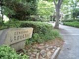 {左}品海公園(ひんかい) 一里塚(2) 北品川1-30-9 江戸初期には一里塚があり現在は「日本橋より2里」の木柱が立てられている。その後ろの街道松は平成12年に改修記念に品川宿内から寄贈されたもの。公園手前の坂道の民家には江戸時代の護岸用の石垣の名残が残されている。 |