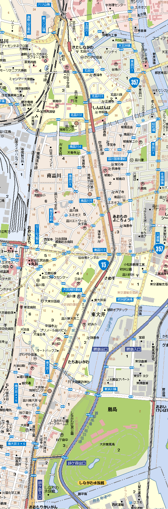 {左}しながわ区民公園 浜川橋を渡ってしばらくして左に並ぶマンション群の裏側に細長い公園が平行し中央口が街道沿いの一角にある。運河を埋め立てて作られたもので野球場、テニスコート、プール、フィールドアスレチック、キャンプ場、道路を挟んで海水を利用した人工湖「勝島の海」、レストラン・ドルフィン、しながわ水族館などがある。トイレ、ベンチも多数あり木陰も多い。