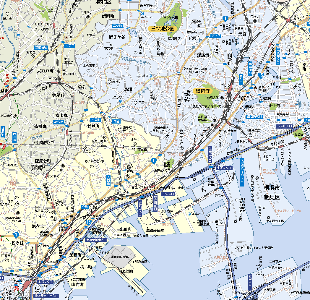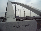 鶴見川橋 鎌倉時代末期の絵図にも描かれている橋で江戸時代に整備され鶴見橋とよばれていたが「鶴見橋」の呼称は下流の第一京浜に取られてしまい現在は「鶴見川橋」という。平成8年に河川改修に合わせ「あるく」「ながめる」「ひと休みする」というコンセプトのもとデザインされ架け替えられた。全長119.6m幅12mの鋼床ニールセンローゼ橋で色や隣接する市場下町公園のデザインは市民参加で決められた。公園内に鶴見橋の案内板がある。江戸時代には橋を渡るとよねまんじゅうを売る店が40軒も軒を連ねていた。 |