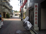 {右}鶴見神社参道 大通りを越えると鶴見神社の参道入口がある。このあたりがかつての鶴見村の中心地で幕末には鶴見関門関所の出張所も置かれていた。旅人相手の茶屋が並び商店のように扉が開け放しで畳を敷いた床上に客が座って休み通りには娘たちが茶わんをいくつもお盆にのせて並び食事を勧めた。参道入口には享保年間にできた鶴見村最大の信楽(しがらき)茶屋があり土間に縁台を置いて竹の皮に包んだ梅干と梅漬けの生姜が売られていた。明治に鉄道ができ駅の無かったこの辺りの人の往来が減り旅人も少なくなると信楽茶屋は蕎麦屋に変わったが太平洋戦争で消失。現在その位置にその名も信楽茶屋というラーメン屋チェーンの店舗がある。 |