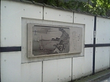 {左}袖ヶ浦の案内板(料亭 滝川の塀)台町8-14 坂を上りはじめるとある。広重の絵と東海道中膝栗毛の一文が書かれている大きなプレート。この辺りは台町と呼ばれ江戸時代には左手がすぐ海で中世以来の港として栄えた神奈川湊(袖ヶ浦)を街道松越しに見下ろす東海道屈指の景勝地として多くの旅人が訪れていた。広重の神奈川宿の絵がこのあたりで絵にあるように茶店も多く東海道中膝栗毛でも女の声につられて野次さん喜多さんが茶店に立寄っている。広重の絵の海の部分は現在横浜駅のあたりになる。袖ヶ浦は宝永4(1707)富士山の噴火の影響で海が浅くなり徐々に埋め立てられ1850年頃には畑と塩田になっていた。 |