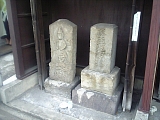 {左}宝蔵院 [真言宗大覚寺派] 吉田町935 国道1号を歩いていくとある。平安時代初期に弘法大師が現在の戸塚税務署辺りに建立したのが起こり。天文16年(1547)に高野山より来た僧・朝興が東峰山 光圓寺として中興した。寛永9年(1632)現在の戸塚駅東口駅前に移転し本尊に不動明王を祀り戸塚不動として有名となり昭和18年に現在地に移転した。現在の本堂は昭和50年の建造。本堂右前にある大日如来石像は創建時に祀られていたもの。その横には文政元年(1818)の徳本上人名号碑、天保15年(1844)の馬頭観音がある。本堂左奥には地蔵堂、手前に慈母観音、右には昭和53年建立の日本舞踊などに使われた扇を供養する扇塚がある。門前には文政4年(1821)の「南無大師遍照金剛木食観正」と刻まれた木食観正碑がある。 |